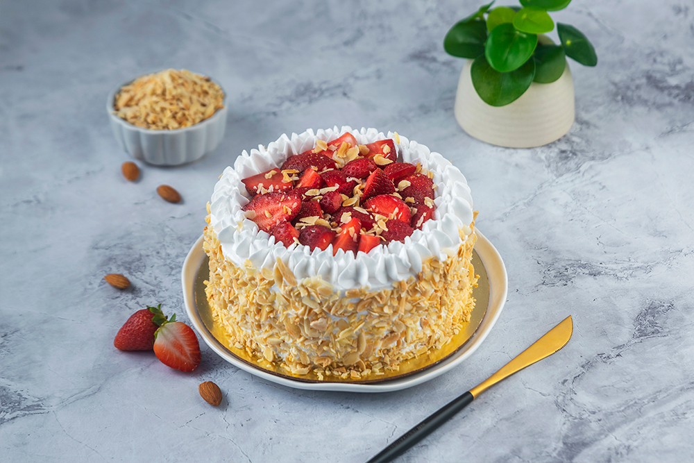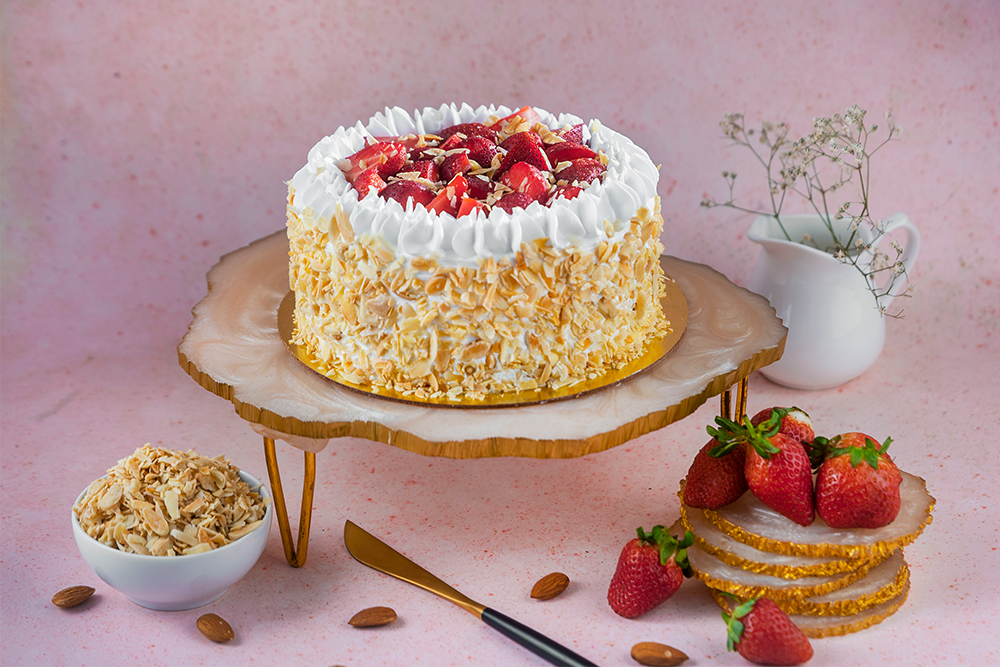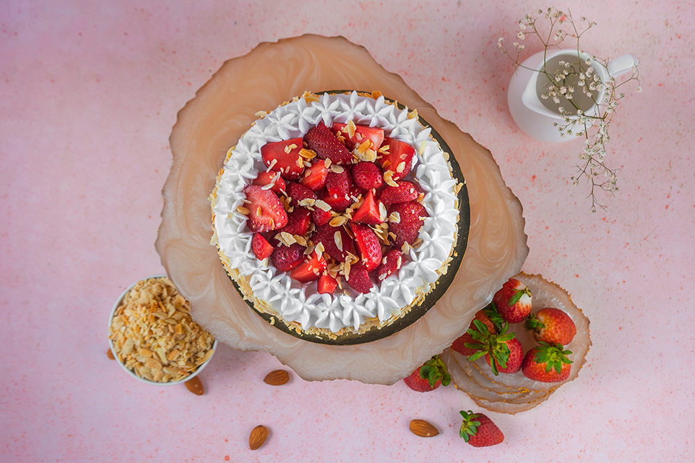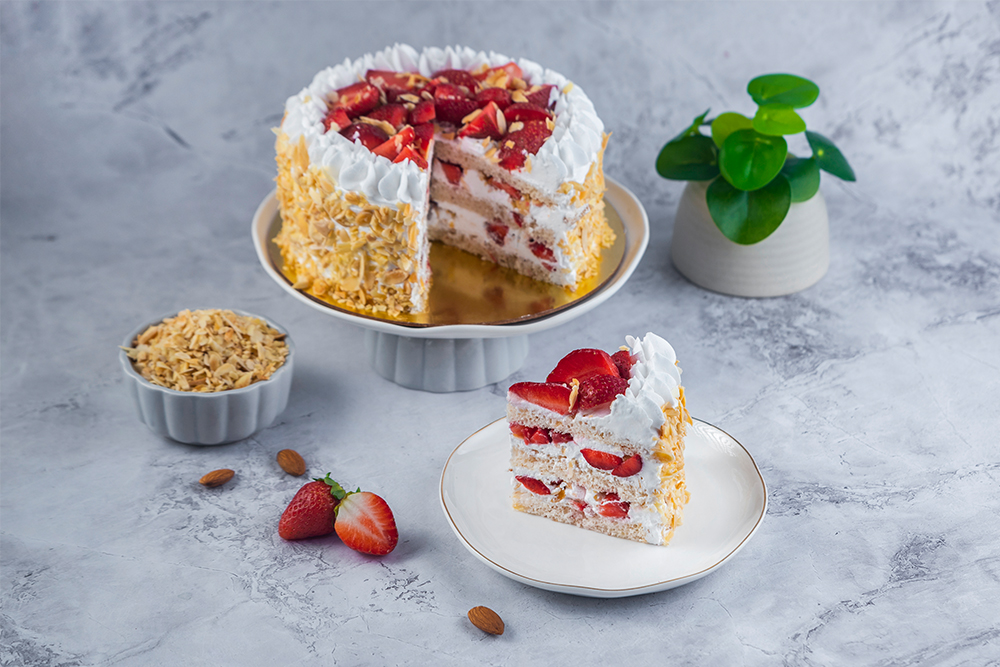 Layers of moist and light spooge cake infused with flavorful fresh strawberries , topped with heaps of glazed fresh strawberries and swoops of whipped cream with a crunch of roasted almonds. Cake, cream, and berries combine in a treat that’s so very delectable!
